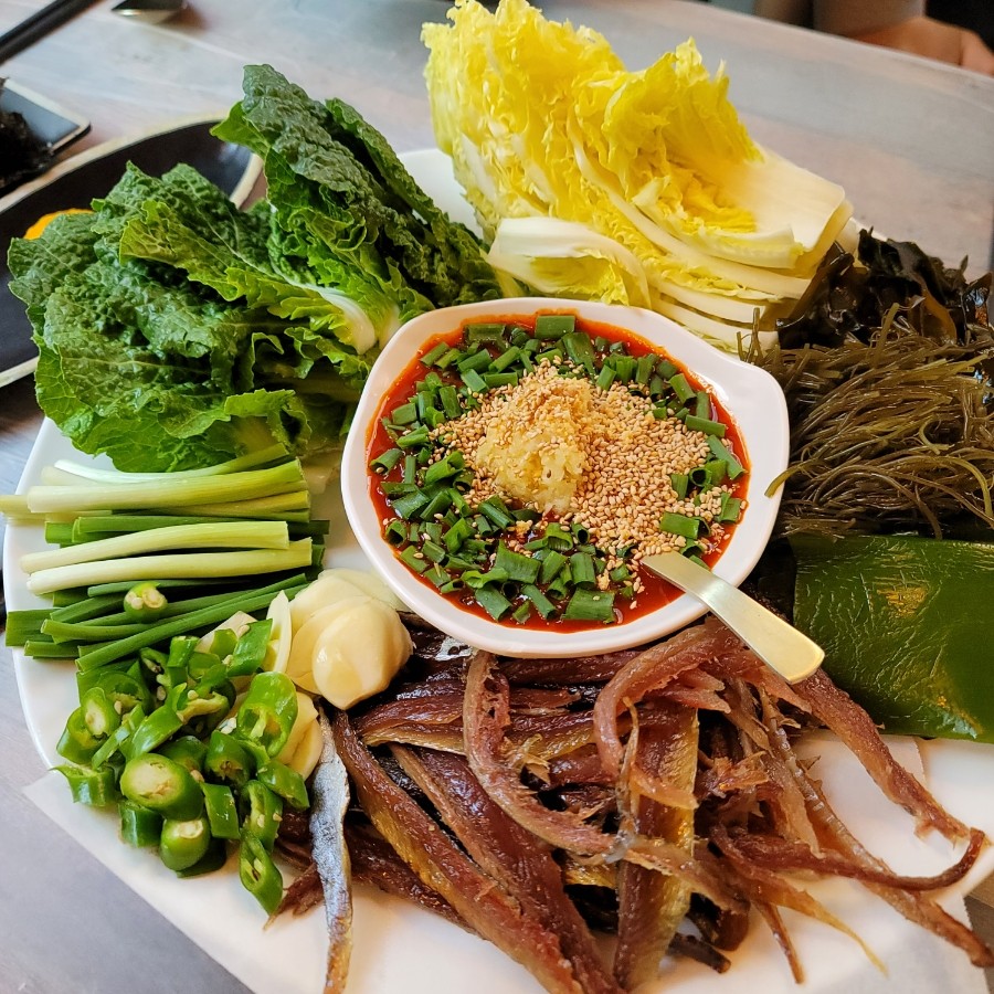 (직접 손질한 과메기와 미역, 김, 쌈 채소, 마늘, 고추 등 기본 곁들임 구성) -