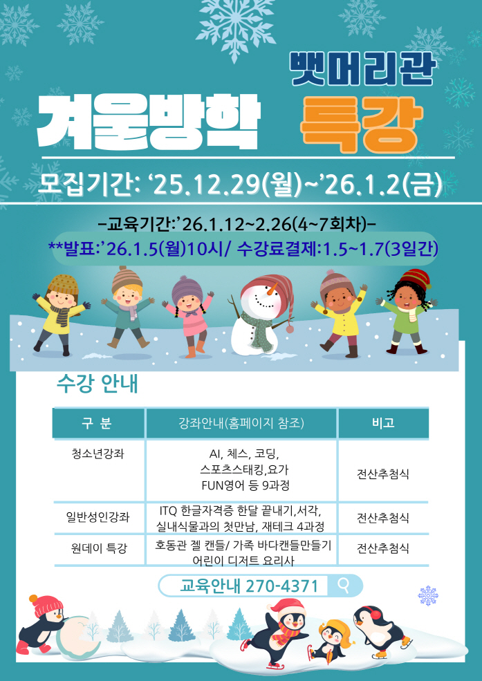• 포항시 뱃머리평생교육관, ‘겨울 특강’ 수강생 1월 2일까지 모집